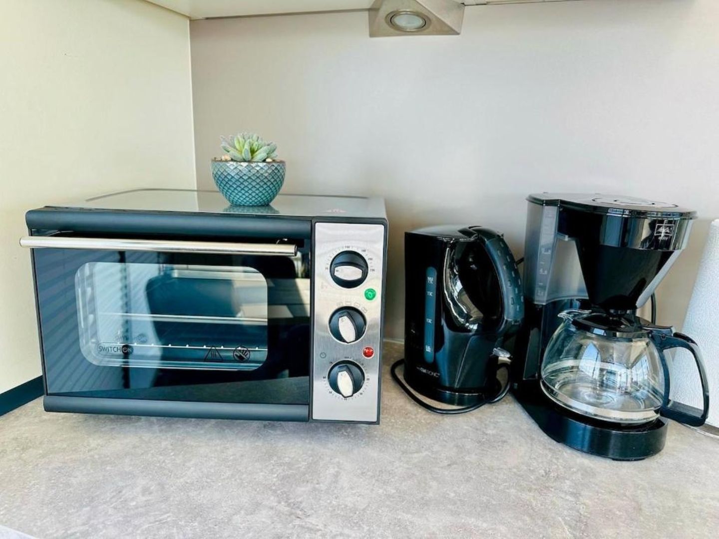 Mikrowelle, Spülmaschine, Kühlschrank, Kaffeemaschine, Toaster, Wasserkocher, Spüle, (Die Küche ist in den Wohnbereich integriert).