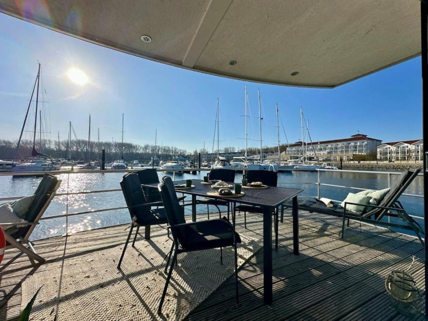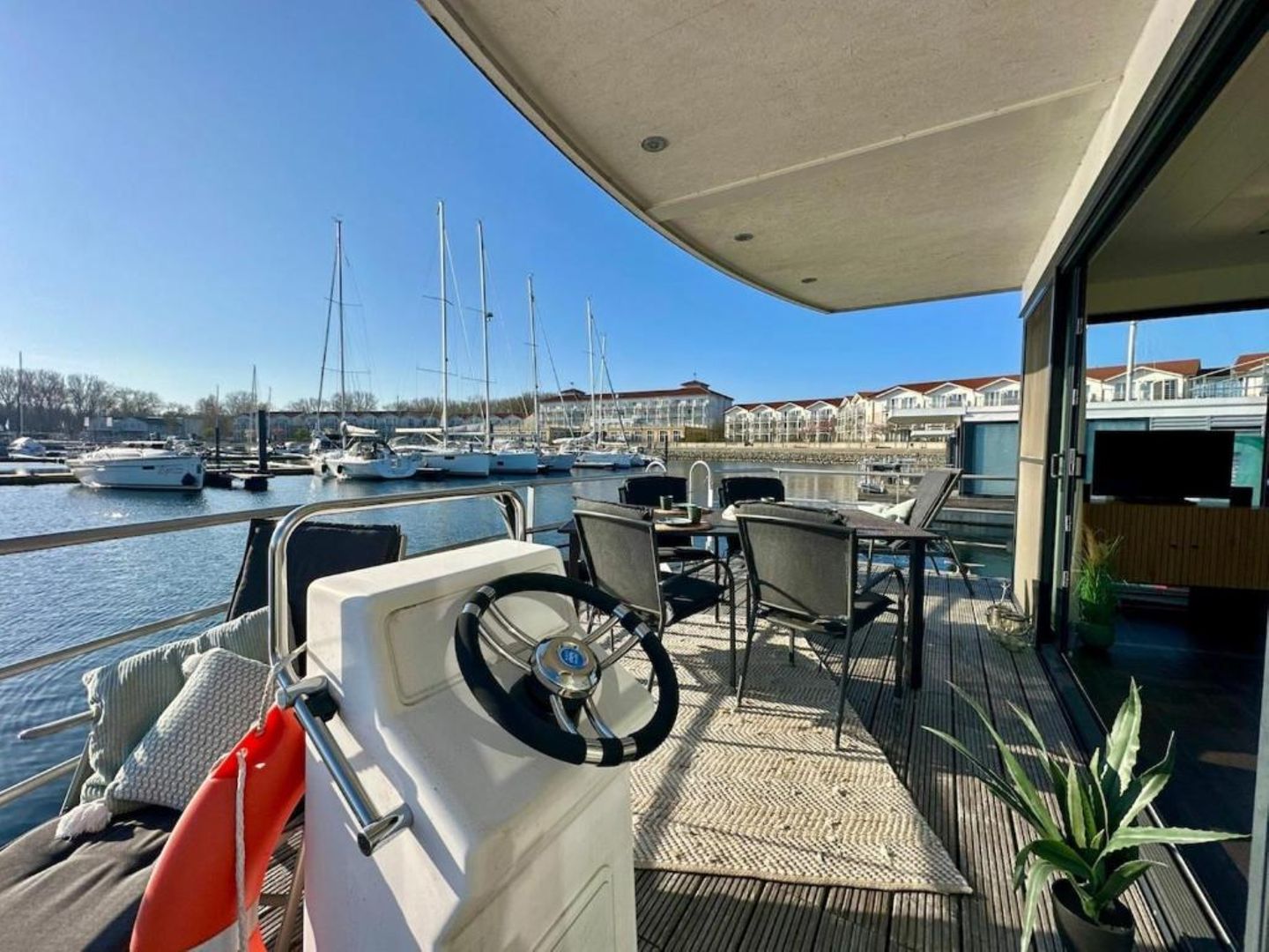 15 qm Terrasse am Bug, möbliert, + Dachterrasse 25 qm, Kostenfreier Parkplatz in der Nähe des Hafens